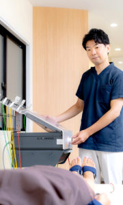 仁−JIN鍼灸整骨院では、治療に入る前にハイチャージを当てることで筋肉をリラックスさせます。そうすることで身体が早く治ろうとするスイッチが入り治療効果を高めます。